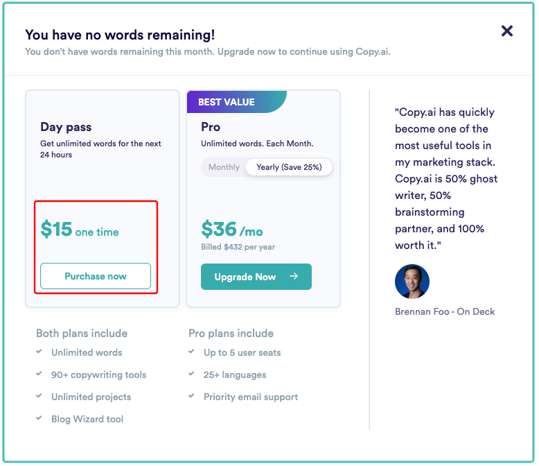 - Share $15 CopyAi Day Pass - Unlimited Words for 24 hours